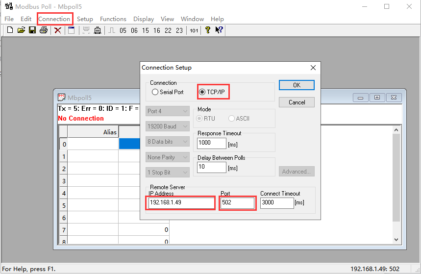 IP: 网关的WAN IP和LAN IP都可以,取决于上位机和网关的网络关系; 端口号:502(固定值);