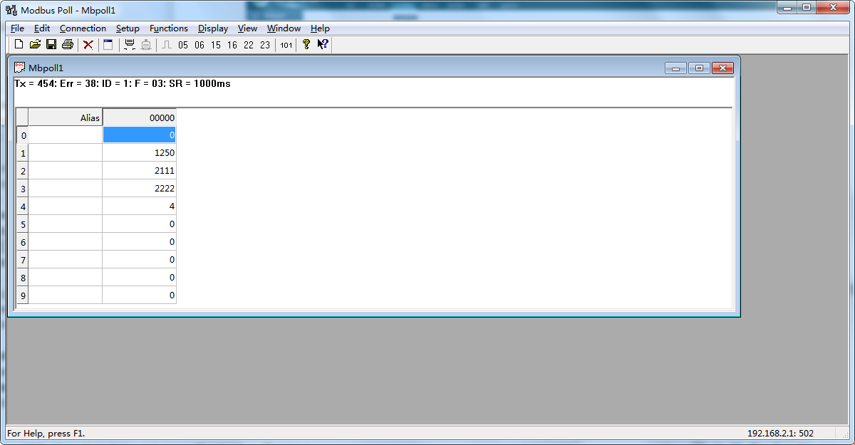 字节顺序:分为大端、小端,用于调整FLOAT、LONG等4个字节类型数据的字节顺序; 读取方式:设备取值(默认)、内存取值(预留功能); 日志大小:20K~10M可选择,默认200K ; 日志等级:致命、错误、警告、通知、信息(默认)、调试; P.s.转发运行出现异常时,请将日志状态调整为“调试”,可打印具体日志,下载转发日志发送至豪门国际技术支持工程师处诊断。为了保证网关快速高效转发,调试完毕后请务必将日志等级调整为信息。 3 用上位机软件读取 网关将通讯协议为“西门子ISO TCP”的设备(西门子S7-1200)转发出通讯协议为“Modbus Tcp”,用modbus poll(上位机软件)读取网关底下的设备数据。